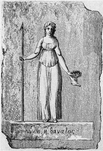 | Ανάγλυφη παράσταση της Ελευθερίας. Το υποθετικό αυτό εύρημα προσεφέρθη από τους Δήμο και Νικολό Στεφανόπουλο στον Βοναπάρτη (χαλκογραφία με χάραξη Guyot) ως δώρο της Μάνης |